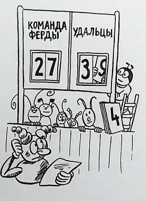 Молодец, Ферда, молодец, Мудрец, молодец, Вумник, вы прекрасно подготовили своих спортсменов! Зимние тренировки принесли свои плоды. Когда зрители посмотрели на табло с результатами, то увидели на нём цифры 38:39. Команда Ферды отставала теперь всего на одно очко. Ферда, догоняй!