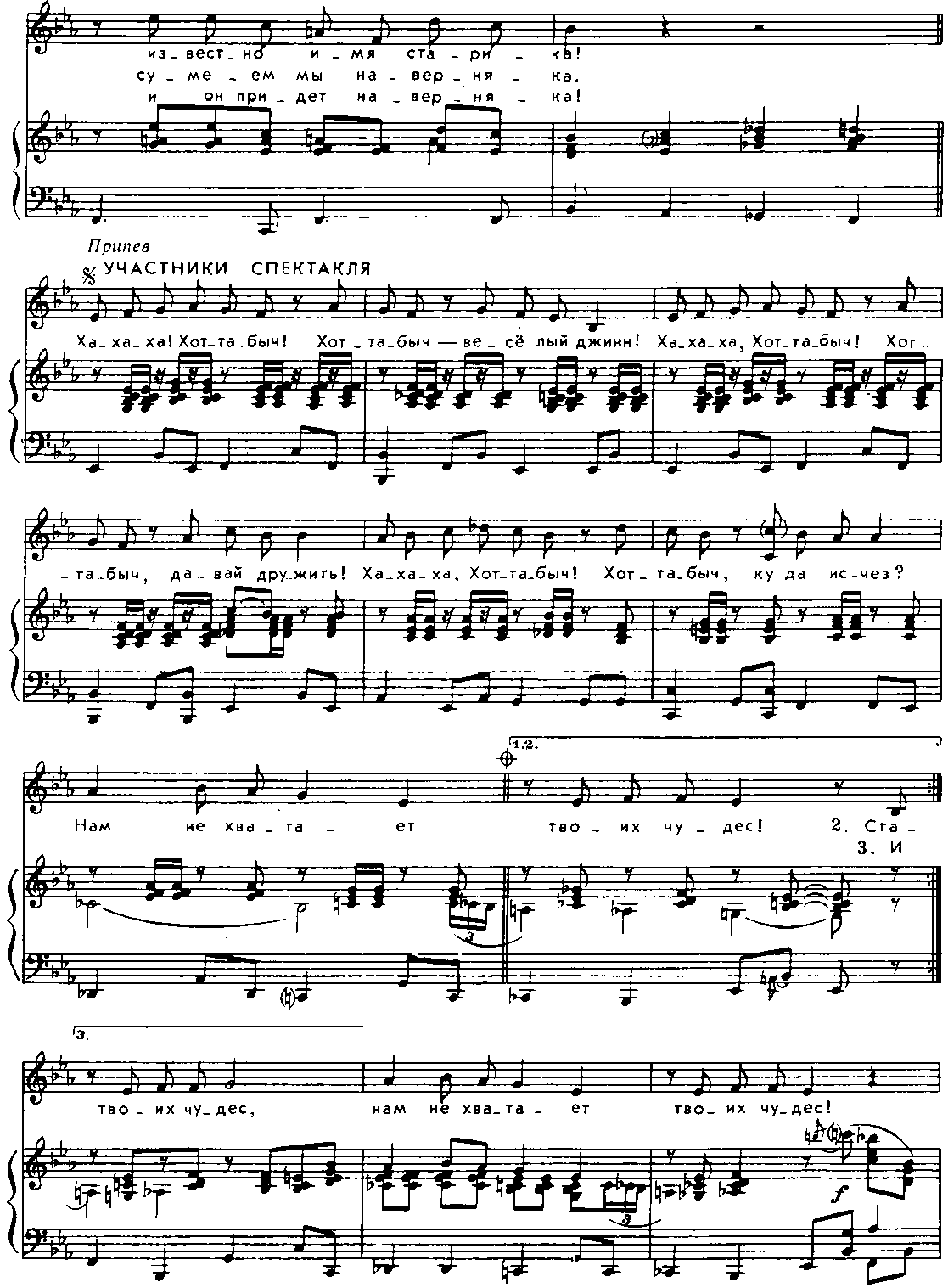 На последних словах песни: Нам не хватает твоих чудес сверху опускается огромный портрет Старика Хоттабыча. Неожиданно правый глаз Хоттабыча подмигивает с портрета зрителям.