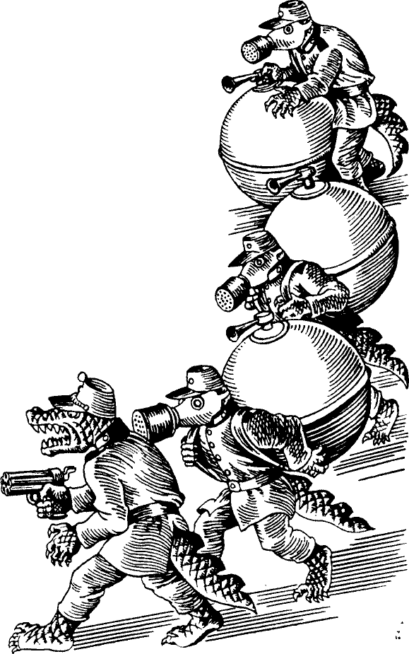 Между тем на помощь надсмотрщикам, получившим пистолеты, прибыло подкрепление: трое зеленохвостых, у которых за спинами висели большие алюминиевые шары. В шарах находился смертоносный газ.