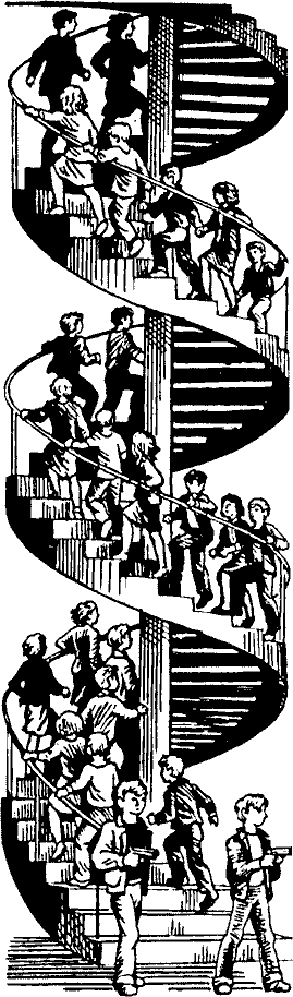 Сначала шли спасенные дети. Они попеременно несли на носилках раненого Бебешку. Следом за детьми вели взятых в плен зеленохвостых. Замыкали колонну, следя, чтобы никто не отстал, мальчики с шестиствольными пистолетами. Их задача была довольно трудной, потому что винтовая лестница была не освещена.