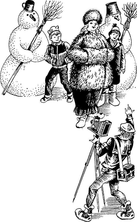 Откуда ни возьмись, появился городской фотограф Топориков. Он пристраивался то так, то этак, стараясь поймать в кадр обоих мальчиков, но каждый раз почему-то впереди них оказывалась тетя Муза. В руках она держала муфту,