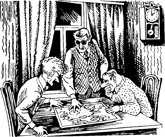 Кучерявочка, Лялька Дудкина и Наташа, несколько дней подряд наблюдавшие за дядей Гошей, рассказали, что он боится своего постояльца в темных очках: когда разговаривает с ним, то заикается и руки держит по швам, как подчиненный перед командиром. Прошлой ночью, в сильный снегопад, к дяде Гоше и его постояльцу приходил парикмахер Эпельсинов, и они втроем просидели почти до самого утра, что-то обсуждая. Эпельсинов развернул перед ними карту, и они, тихо переговариваясь, водили по ней пальцами
