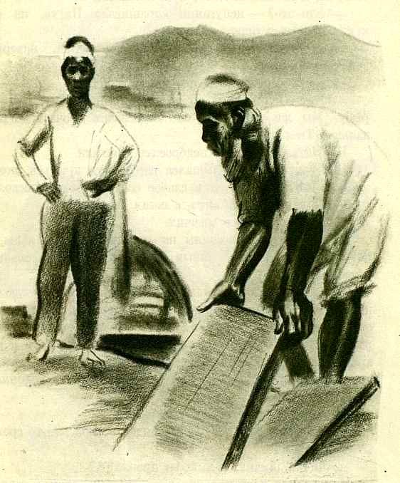 А день все стоял над океаном, не склоняясь ко сну, и был прозрачен и блестел, как те легкие пузыри пены, которые так ловко умел выдувать Ти-Суеви на конце сухой тростинки. И не верилось, что утром шел дождь. Только западная стена школы, обращенная к сопке, напоминала об этом. В тени, куда не проникали солнце и ветер, она еще была темна.