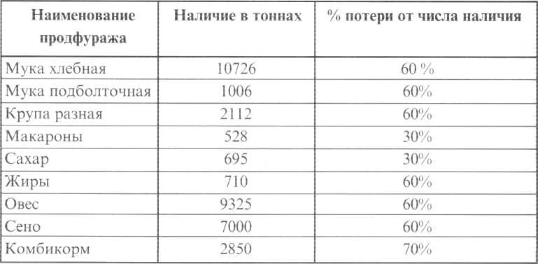 По неполным данным начальника продотдела Западного фронта интенданта 1 ранга Разина потери запасов продфуража войсками Западного фронта по состоянию на 1 сентября 1941 года достигли 60-70% (табл. 29) .
