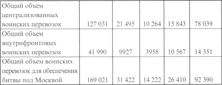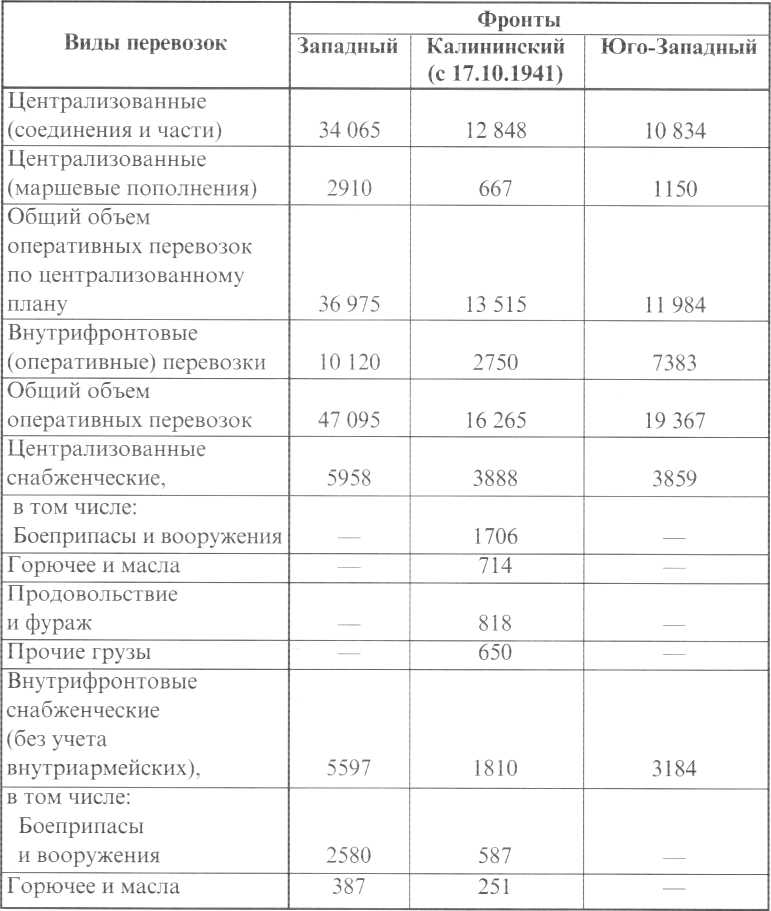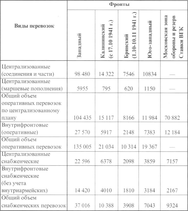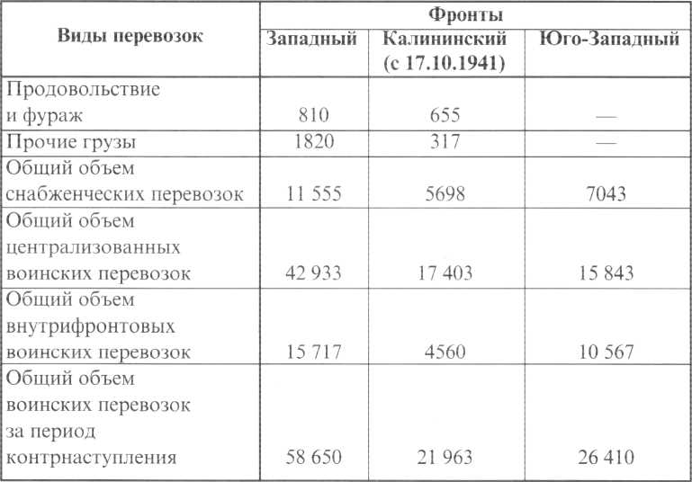 Принятые меры позволили в целом успешно решить задачи по организации централизованных и внутрифронтовых снабженческих железнодорожных перевозок. Общий объем перевозок, выполненных железнодорожным транспортом в период оборонительной операции и в ходе контрнаступления войск Красной Армии под Москвой, представлен ниже.