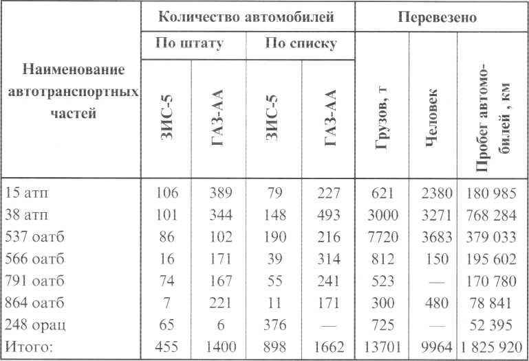 Таким образом, только за январь месяц 1942 года автотранспортом тыловых частей Западного фронта было перевезено 13 701 тонна различных грузов, при этом автомобилями был совершен пробег 1 825 920 километров1 .