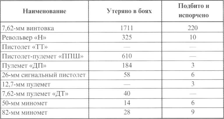 З.С. Шехтман) 8-й гвардейской стрелковой дивизии имени генерала Панфилова в период с 18 января по 1 апреля 1942 года было утеряно: винтовок 966. карабинов 41. винтовок СВТ 28, автоматов ППД - 196, станковых пулеметов 9. противотанковых ружей 29 .