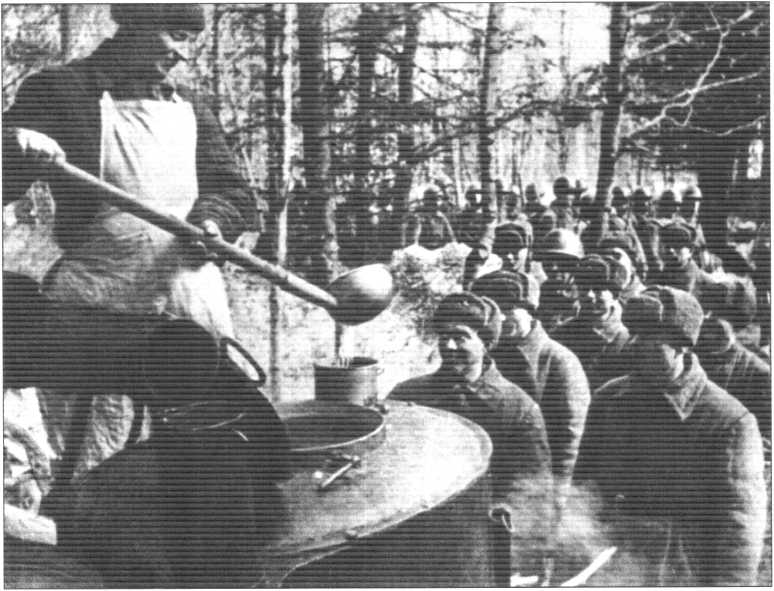 Отсутствие необходимого ассортимента продовольствия и возможностей по приготовлению пищи приводило к тому, что бойцы и командиры, особенно находившиеся на переднем крае, очень часто питались сухим пайком, не употребляя даже горячего чая. Причем под сухим пайком понималось не то, что мы знаем по армейской жизни: набор консервов, которые только надо разогреть и они готовы к применению, а часть наименований продуктов, выдававшаяся россыпью. А дальше личный состав должен был думать, как из них приготовить себе пищу. От длительного отсутствия горячей пищи в войсках, особенно в частях и подразделениях, находившихся на передовой, резко участились случаи желудочно-кишечных заболеваний1 .