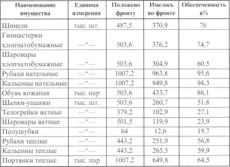 Обеспеченность войск Западного фронта зимним вещевым имуществом на 1 ноября 1941 года