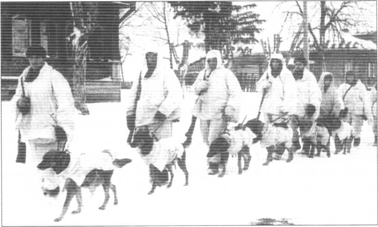 | Отряд истребителей-охотников в собаками истребителями танков отправляется на боевое задание. Западный фронт. Декабрь 1941 г. |