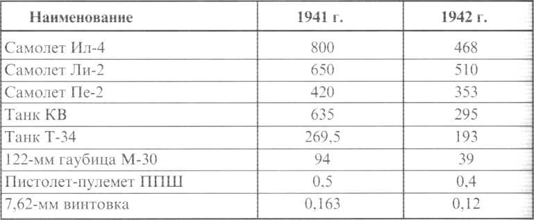 Таблица 21 Стоимость некоторых видов вооружения и боевой техники в 1941-1942 гг. (в тыс. рублей за единицу)