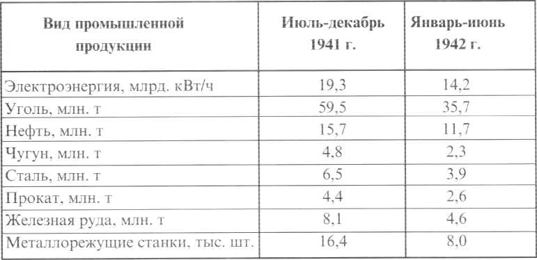 Производство основных видов промышленной продукции с июля 1941 г. по июнь 1942 г.