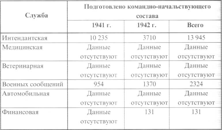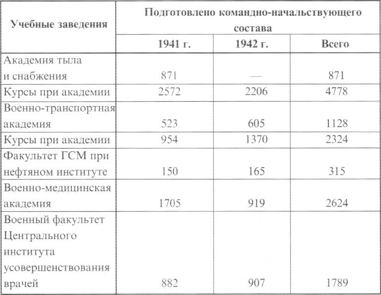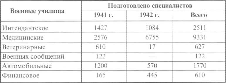 Таким образом, высшие военно-учебные заведения проделали в 1941-1942 годах войны очень большую работу по подготовке для тыловых органов Красной Армии значительного количества квалифицированных специалистов. По оценке командиров частей и соединений молодые офицеры, выпускавшиеся интендантскими, медицинскими, ветеринарными и другими военными училищами, хотя и не были подготовлены в достаточной степени, однако вполне удовлетворяли основным требованиям военного времени.