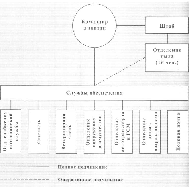 В службу обеспечения входили: отделение интендантского снабжения, санитарная часть, ветеринарная часть, отделение вооружения и имущества, отделение автотранспорта и горюче-смазочных материалов, отделение дивизионных подразделений подвоза, а также полевая почта (схема 6).