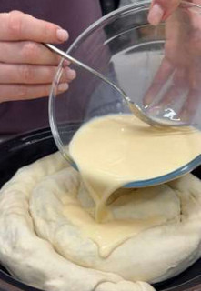 7. Уложить рулет по спирали (начиная с центра) в форму для выпекания, предварительно смазанную маслом. Диаметр формы 28 см.