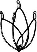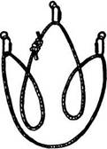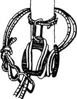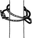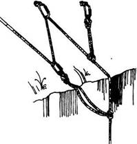 На двух крюках принцип вязки тот же. Веревочное кольцо встегивают в карабины на двух крюках, нижнюю ветвь один раз перекручивают и подтянув к ней верхнюю встегивают карабин в обе ветви (рис. 3132).