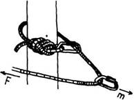На рис. 40 изображена так называемая «длинная петля». Это простейший полиспаст. Один конец веревки (коренной) крепится на рельефе, середина веревки встегивается в карабин, закрепленный на «грузе», так, чтобы она могла свободно скользить сквозь карабин. За второй (рабочий) конец веревку вытягивают. В этой схеме половина веса «груза» приходится на точку закрепления веревки, а другая половина на тех, кто вытягивает веревку. На спасательных работах эту схему применяют, обычно, для подъема легкопострадавшего. Если спасатели случайно отпустят рабочий конец веревки, то пострадавший сорвется вниз. Чтобы этого не произошло, рабочий конец веревки необходимо подстраховать схватывающим узлом (на рис. 40 не показан). Эта же схема часто используется в качестве страховочной системы схватывающегоузла в карабинном тормозе (см. КАРАБИННЫЙ ТОРМОЗ ).