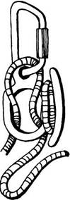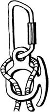 В случае отсутствия отдельного куска основной веревки, поступают следующим образом: на веревке вяжут австрийский проводник, в него встегивают карабин, на карабин одевают «ВОСЬМЕРКУ», рабочий конец обводят вокруг выступа рельефа и закрепляют в «ВОСЬМЕРКЕ». Как и в первом случае, ходовой конец веревки закрепляют на коренном, образуя карабинную удавку (рис. 39). При нагрузке «ВОСЬМЕРКУ» может прижать к выступу рельефа и последующее протравливание веревки составит проблеммы. Лучше сразу рассчитать длину рабочего конца так, чтобы при нагрузке вся система повисла в воздухе.