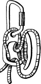 На точке страховки крепится карабин. На него надевают тормозное устройство типа «ВОСЬМЕРКА». Середина рабочего конца веревки закрепляется в тормозном устройстве. На самом конце вяжется узел восьмерка, в который встегивается карабин. Восьмерка вместе с карабином обводится вокруг грузовой точки (дерева, выступа рельефа) и застегивается карабином на коренной (нагружаемый) конец (рис. 38). Если вдруг лопнет грузовая петля, рассыпется «ВОСЬМЕРКА» или разорвется ее карабин, то нагруженная веревка повиснет на карабиннойудавке. При необходимости снять нагрузку карабин удавки отстегивают, веревку разматывают, освобождая тормозное устройство, сквозь него протравливают веревку и этим снимают нагрузку.
