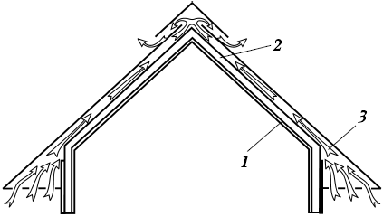 Рис. 4. Система вентиляции скатной кровли в доме с жилой мансардой (поперечный разрез): 1) пароизоляция; 2) утеплитель; 3) движение воздуха
