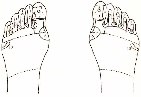 Зоны глаз располагаются на втором и третьем пальцах, а ушей на четвертом и пятом. Эти зоны простираются вплоть до места прикрепления пальцев к плюсневой кости на конце третьей фаланги (смотри на стр. 27). При сгибании пальцев начало плюсневых костей хорошо видно. Оно лежит существенно глубже межпальцевой кожи (в противоположность рукам попробуйте сами убедиться в этом).