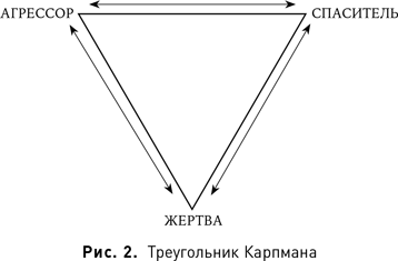 При создании несложных жанровых произведений, в которых характеры героев нередко подменяются их функциями, зачастую помогает картина распределения ролей, основанная на так называемом треугольнике Карпмана (рис. 2), придуманном для описания социального и психологического взаимодействия настоящих людей в обществе и трудовых коллективах. Например, герой упомянутого «Мальтийского сокола» знакомится с «жертвой» беззащитной женщиной. «Жертве» угрожает «агрессор», и герой становится «спасителем». Однако беззащитная особа оказывается роковой женщиной и из «жертвы» превращается в «агрессора», а «спаситель» сам становится «жертвой» и вынужден искать в себе силы и возможности, чтобы победить.