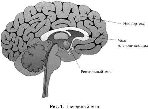 берутся эмоции? Американский нейрофизиолог Пол Маклин считал, что мозг это трехслойный орган, и, хотя его слои, с одной стороны, тесно взаимосвязаны, с другой стороны, они несколько обособлены друг от друга. Теперь Маклина почитают как автора концепции «триединого мозга» (рис. 1), на которой основаны наши сегодняшние воззрения на структуру мозга.