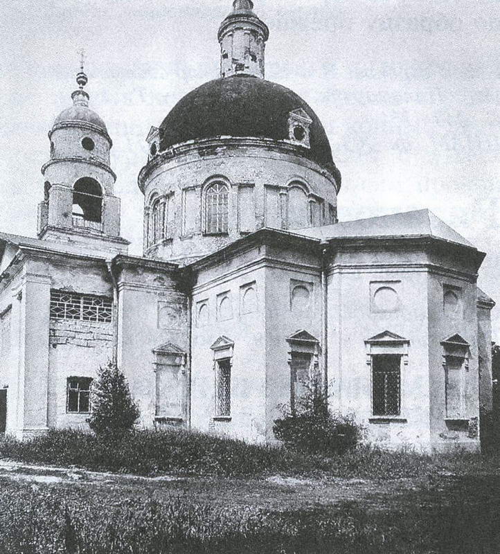 25. ЦЕРКОВЬ РОЖДЕСТВА БОГОРОДИЦЫ, заложенная по инициативе А.И.Повалишина около 1805 и оконченная в 1815 г., основательно перестраивалась и расширялась в середине и во второй половине XIX в. Длительность формирования памятника почти не отразилась на его строгой архитектуре, представляющей незаурядный образец зрелого классицизма московской школы. Крупное монументальное здание с выраженной продольной осью сложено из кирпича, оштукатурено, профилированные детали выполнены из белого камня. Наиболее ранним элементом постройки и ее композиционным центром служит мощная двусветная ротонда, включенная вместе с двухпридельной трапезной в единый прямоугольный объем с тяжелыми портиками упрощенных форм на поперечной оси храма. Увенчанная высоким куполом с люкарнами и глухим барабаном главы, ротонда разработана с помощью трехчастных ниш и вписанных в них арочных окон. Мотив ниши и сандрика над проемами, неоднократно повторяясь на других частях здания, служит основным в декорации их гладких фасадных поверхностей. Общую композицию сооружения завершает высокая ампирная колокольня в четыре яруса с цилиндрическим резонатором звона.