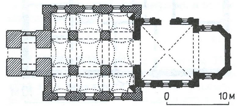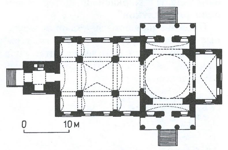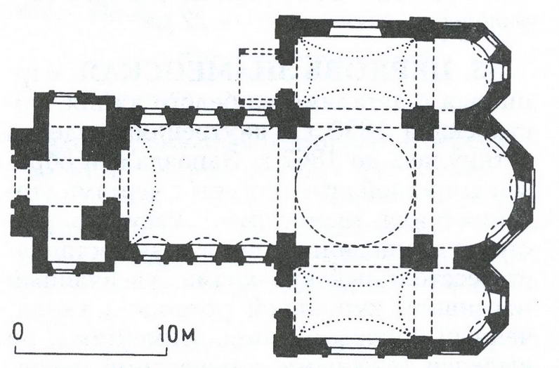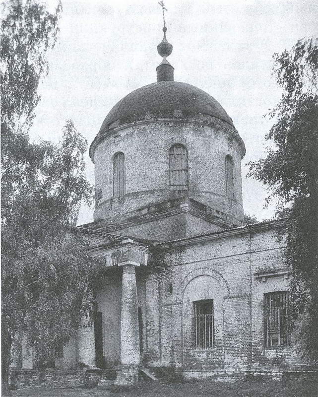 15. ЦЕРКОВЬ ЗНАМЕНСКАЯ, кирпичная с деталями из белого камня, построена в 1850 г., внутренняя отделка затянулась до 1862 г. Запоздалый образец ампирной архитектуры с чертами угасания стиля, здание имеет осевую трехчастную композицию. Ее основу составляет бесстолпный куб храма, увенчанный массивной купольной ротондой; увеличенный боковыми компартиментами, он выделен тяжелыми дорическими портиками с фронтонами. Двухпридельная четырехстолпная трапезная с коробовыми сводами, вопреки канонам классицизма, имеет четное количество световых осей. В довольно разнообразной, близкой алтарю