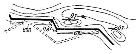 Фланкирующие точки, в особенности для рвов, нужно сажать за обратными скатами отдельных возвышенностей (рис. 24), в извилинах (рис. 25) и складках местности. При разбивке фасов рва необходимо особенно тщательно изучить местность, все малейшие ее извилины и возвышенности, за которыми можно было бы скрыть фланкирующие сооружения от наземного наблюдателя.