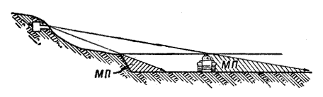 Рис. 36. Мертвое пространство во рву при огневой точке, находящейся на возвышенности