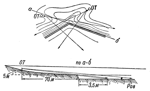 На холмистой местности вопрос о простреле продольным огнем рва и одновременно подступов к нему может быть решен иначе, а именно расположением огневых точек на, более высоких отметках, чем трасса рва (рис. 34). Так, например, при общем превышении нулевой линии над поверхностью рва в 5 м и расстоянии огневой точки от бровки рва в 70 м мертвое пространство будет равно 35 м. В этом случае хотя огонь до известной степени и потеряет свою настильность, но прострел всего рва будет наиболее обеспечен.