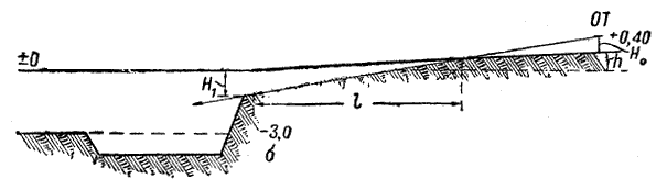 В зависимости от заданных величин H0 и L, разницы отметок местности, огневой точки и бровки рва h, глубины срезки H1 (что зависит от допущенного мертвого пространства во рву) длина скоса l будет: