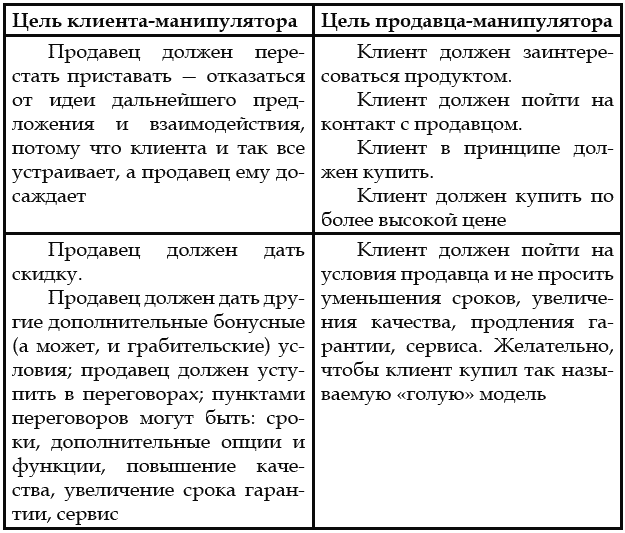 Давайте перечислим основные цели клиента-манипулятора и продавца-манипулятора.