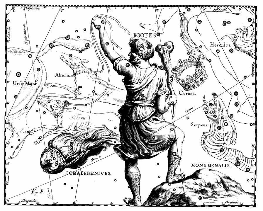 Слева созвездие Большая Медведица (Ursa Major), в руках Волопаса сворки, ни которых сидит созвездие Гончие Псы Астерион (Asterion) и Чара (Chara), под ними созвездие Волосы Вероники (Coma Berenices). Справа созвездие Северная Корона (Corona) за спиной созвездия Геркулес (Hercules), ниже голова созвездия Змея (Serpens), разевающей пасть на созвездие Северная Корона. Волопас опирается ногой на созвездие Гора Менала (Mons Menalus), в руках у него дубина.