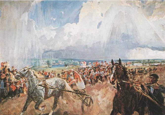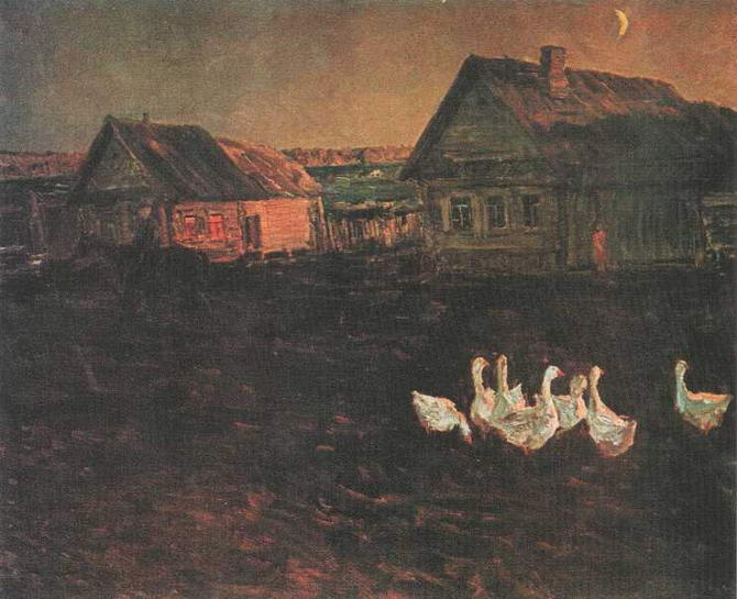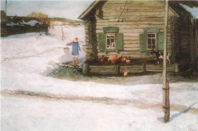 У художника нет ни малейшего предубеждения против сугубо технических вещей, прочно вошедших в крестьянский обиход. К примеру, поэтическое очарование образа картины Полдень (1961) нисколько не страдает от присутствия в ее предметном антураже характерной приметы индустриального века - мотоцикла, трактованного с не меньшей пластической прочувствованностью, нежели человеческие фигуры и природные тела. Его металлическая «бездушная» конструкция словно оживает под кистью мастера, становится носителем светлого, теплого чувства жизни, резонатором человеческих свойств и переживаний.