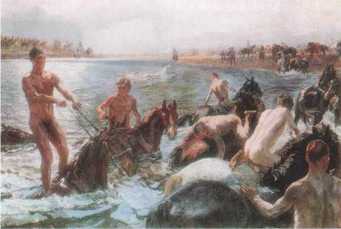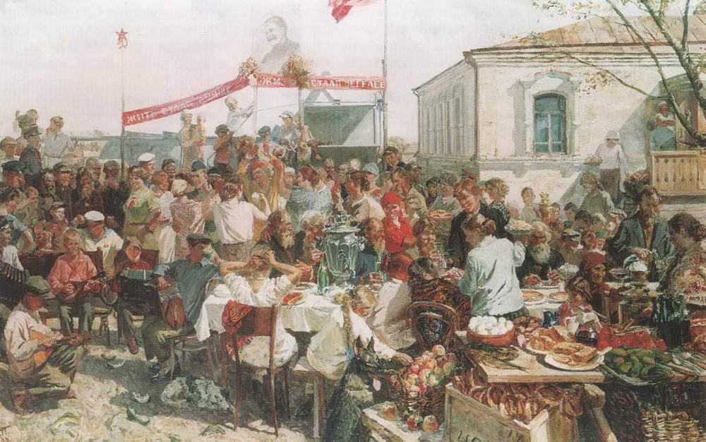 До отказа заполненная разнообразными делами, заботами крестьянская доля не кажется ему идиллически счастливой, этакой воплощенной мечтой о земном рае и великом примирении. Даже в подчеркнуто светлой, праздничной атмосфере довоенной картины Колхозный праздник (1937), где бушует стихия крестьянского пира по случаю богатого урожая, присутствует элемент тревожной аритмии, скрытого диссонанса. В построенной на системе противовесов группировке персонажей есть ощущение фатальной скученности, жизненно оправданной и все же несколько утрированной сумятицы. Отвечая на сетования некоторых критиков, упрекавших картину в отсутствии единого объединяющего фокуса и композиционного центра, художник признался, что преследовал иную задачу. «На таких вот пирах сам черт не поймет, где самое главное и важное и что надо смотреть прежде всего. Шум, толчея, гам, песни. Я не пытался отдельные составные части композиции принести в жертву какому-нибудь отдельному моменту. Мне, напротив, хотелось, чтобы все путалось между собой до неразберихи и было забавно