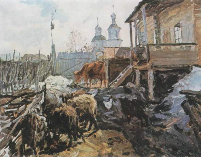 В картине Гость с фронта (1944) изображена сцена деревенского застолья по случаю приезда в родные места фронтовика-односельчанина. Мы отчетливо различаем участвующих в нем лиц, детали обстановки, домашнюю снедь и утварь. Все обрисовано с наглядной очевидностью и реалистической конкретностью. Улыбки и позы сидящих за общим столом людей подсказывают, что их общение проходит в атмосфере искреннего радушия и веселья. И все же, внимательно рассматривая картину, приходишь к заключению, что чудо образного предворения знакомой и близкой автору реальности совершилось не до конца. Словно не хватило самой малости, чтобы изображенное событие вышло за рамки внешней достоверности, обрело необходимую внутреннюю масштабность. И, хотя эту работу нельзя отнести к творческим неудачам, она явно проигрывает рядом с поэтически насыщенными картинами тех же лет, таких как Суббота (1943-1944), Трактористки (1943-1944), Март (1944). В эмоционально-образной структуре этих произведений доминирует родственная интонация, разлито настроение живой веры в неизбежное торжество света и разума, добра и правды. В одном случае социально-значительная эмоция {Март) слита с ощущением наступившей весны, животворным биением свежих сил проснувшейся природы. В другом {Трактористки) - подлинная правда общественных и нравственных чувств выражена вместе с чувственно-пластической красотой простой жизненной сцены, в которой активно взаимодействуют лирически одушевленная пейзажная среда и совершенно неожиданный, явно солирующий жанровый мотив. Весомость и материальность переданной