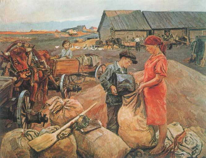 Война с фашистами заставила переключиться на другие темы. Отвечая на вопросы, поставленные трагическим ходом событий, художник создает работы Немцы идут. Июль. 1941 год (1941), К партизанам (1942), передающие энергию народного сопротивления силам зла и разрушения, но глубиной эмоционального проникновения а драму жизни уступающие такому шедевру, как Фашист пролетел. Сенокосная пора 1944 года дала художнику новый обильный материал для