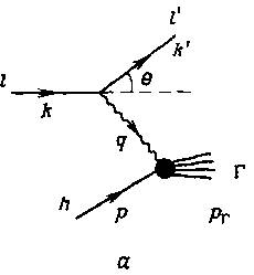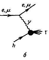 Рассмотрим процесс l+hl'+all, где l и l' лептоны, h -адронная мишень, а символ all обозначает суммирование по всем возможным конечным состояниям Γ (рис. 12, а). Если начальный и конечный лептоны совпадают, т.е. l=l'=e (электрон) или μ (мюон), (рис. 12, 6) то этот процесс представляет собой исследование адрона h в низшем порядке теории возмущений по электромагнитному взаимодействию, а соответствующим оператором является электромагнитный ток
