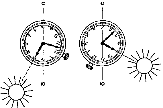 Обычные часы с циферблатом могут служить также и компасом. Чтобы найти стороны света, нужно направить часовую стрелку на Солнце. Линия, мысленно проведенная посередине циферблата между часовой стрелкой и цифрой «1», укажет направление на юг. За спиной тогда окажется север, слева восток, справа запад. Если часы были переведены на летнее время, то на Солнце нужно направлять цифру « 2 ».