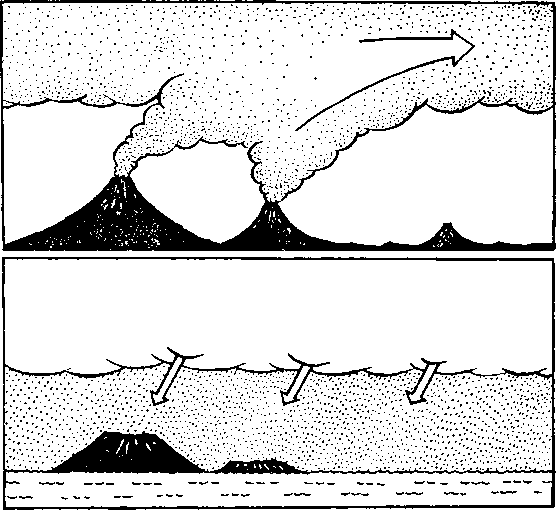 Кроме паров воды в магме были растворены газы, которые составили воздушную оболочку Земли атмосферу. Из вулкана выходит не только лава, стекающая по склонам огнедышащей горы, но и раскаленные газы. Более трех четвертей общего количества газа, вырывающегося из жерла вулкана, составляет водяной пар. Пар, попадая в более холодный воздух, быстро превращался в капли воды и проливался дождем.