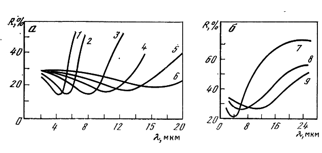 Спектральные зависимости коэффициента отражения кремния, легированного сурьмой, мышьяком и фосфором, с концентрацией свободных носителей заряда (электронов) от 7,4×1018 до 1,67×102° см-3, и арсенида галлия, легированного цинком, с концентрацией свободных носителей заряда (дырок) от 1,7×1019 до 1,5×1020 cм-1, представлены на рис. 2.2, где хорошо видны положение минимума на спектральных кривых отражения от поверхности кремния и арсенида галлия и зависимость длины волны минимального отражения от концентрации свободных носителей.