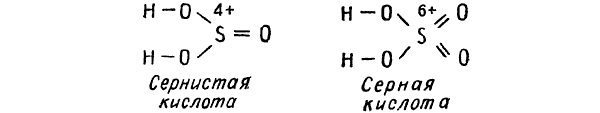 Сера легко принимает на внешнюю оболочку два электрона. Она становится отрицательно двухвалентной, и в такой форме входит в молекулу сероводорода H2S. Основные положительные валентности серы: 4+ и 6+. Например, в двуокиси серы, или сернистом ангидриде SO2, сера положительно четырехвалентна, а в трехокиси, или серном ангидриде SO3, шестивалентна. Соединяясь с водой, эти окислы дают соответственно сернистую и серную кислоты: H2SO3 и H2SO4. Структурные их формулы имеют знакомые каждому школьнику начертания: