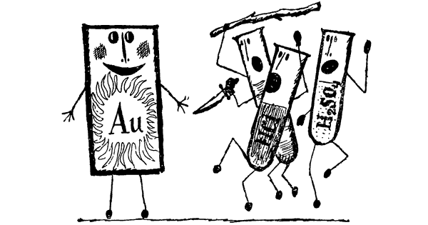 и азотной, а также горячую селеновую кислоту. Вот и все. Что же касается щелочей, то они ни при каких обстоятельствах не разъедают золото. Именно эту химическую «леность» подразумевает химик, когда называет золото благородным металлом.