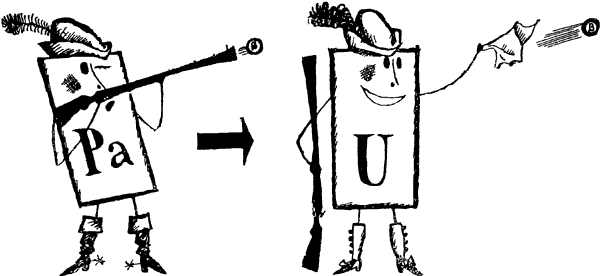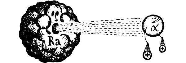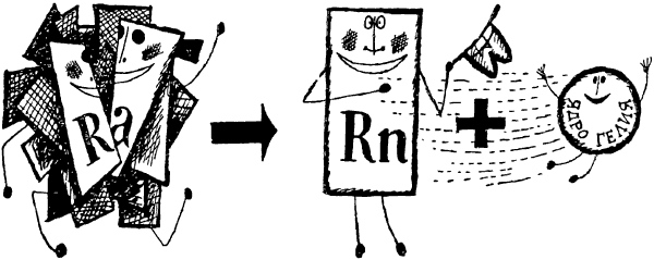 Что же происходит с ядром, когда оно испускает альфа-частицу? Поскольку заряд его уменьшается на две единицы, очевидно, оно превращается в ядро элемента, стоящего на две клетки левее в периодической системе. Атомный вес его уменьшается на четыре единицы. В качестве примера можно привести превращение атома радия в радон: радий радон + альфа-частица.