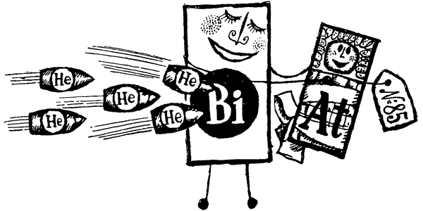 В этом случае нельзя было исходить из элемента 84 полония. Полоний сам радиоактивен и присутствует на Земле в очень малой концентрации. Пришлось «пропустить» один номер и взять мишень из висмута ( 83). И чтобы восполнить недостаток двух положительных зарядов, висмутовая мишень облучалась ядрами гелия, в результате возникали атомы нового элемента с порядковым номером 85.