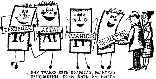 Первое время никому не казалось странным, что у новых элементов нет химических названий. В те дни они еще не получались в больших количествах, не были известны их многие химические свойства, никто не видел даже самых простых принадлежащих им соединений. Все эти элементы казались мало похожими на хорошо изученные «классические» элементы периодической системы.