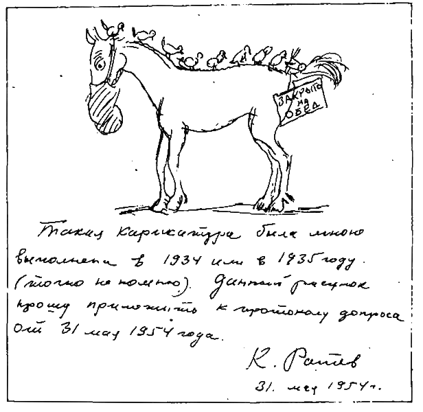 В печати этот рисунок не помещался, поэтому до широкого круга лиц он не доводился. Во всяком случае, никакого антисоветского замысла в нем не было. Начерченную сейчас мною схему этого рисунка я прошу приложить к настоящему протоколу. Обстоятельства изготовления этого рисунка может подтвердить Мануильский Михаил Захарович Кто из сотрудников журнала «Крокодил» присутствовал на темном совещании в то время, я сейчас не помню. Сохранился ли подлинный рисунок в альбоме журнала «Крокодил», я не знаю».