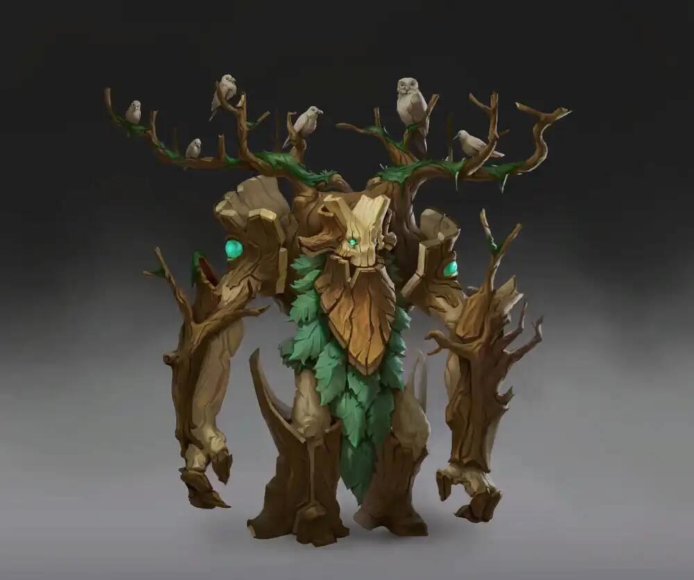 3й прием и последний на третьем круге магии, было умение создавать древесных големов и умение ими управлять. Для создание подобной зверюги подойдет любое дерево, как живое так и не живое, главное чтобы это были твердые породы древесины, но с живым работать проще. Для создание, необходимо на дереве вырезать рунные цепочки и рунные круги, цепочки рун преобразуют тело из дерева в голема, а рунный круг пропишет определенный шаблон действий. Для мертвого дерева, нужно еще напитать его манной с преобразованием ее в живу древесного типа, а дальше все тоже самое. На выходе мы получаем древесного гуманоида, с ветвями-рогами на голове и бородой из листьев на лице без носа.